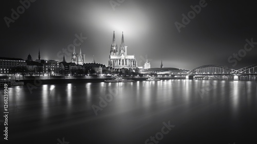 © budi, Fototapeta premium Nighttime view of a historic city skyline featuring a grand cathedral and illuminated bridge over a calm river