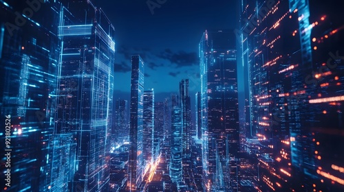 Obraz premium Nighttime view of a technologically advanced city with sleek, illuminated...
