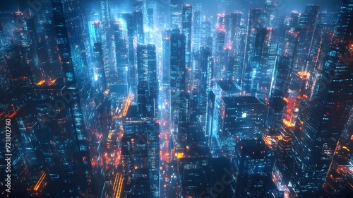 Obraz premium Nighttime view of a technologically advanced city with sleek, illuminated...