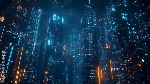 Obraz premium Nighttime view of a technologically advanced city with sleek, illuminated...