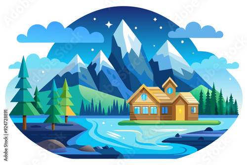 Naklejka premium Nighttime View of a Wooden Cabin Nestled in a Mountain Valley