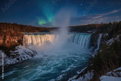 © -Quantum Pixels-, Fototapeta premium Nighttime view of cascading waterfalls surrounded by icy winter landscape