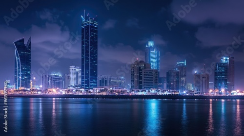 © arthit, Fototapeta premium Nighttime view of the Four Seasons and Hilton Hotels in Manama, Bahrain, their lights creating a striking contrast against the dark sky.