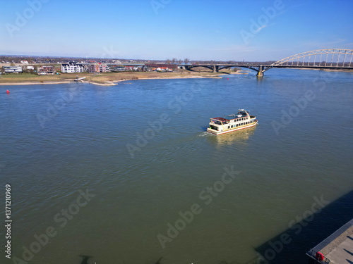 © Yakup, Fototapeta premium Nijmegen Serenity: River Reflections Under a Vast Blue Sky.