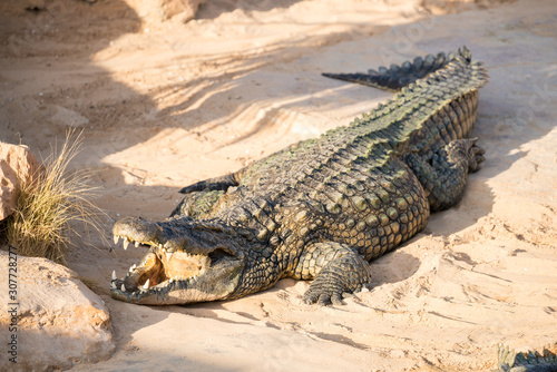Fototapeta premium Nile crocodile with open jaw bask in the sun. Crocodile farm in Tunisia.