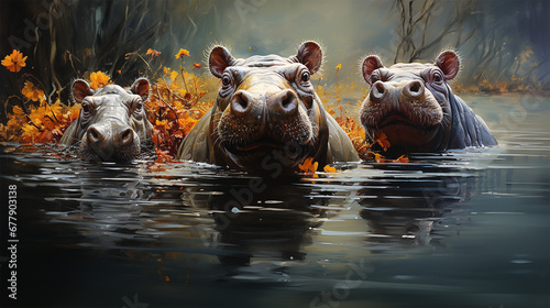 © NHDesign, Fototapeta premium Nilpferde im Wasser, 3d Render. Digitale Illustration.