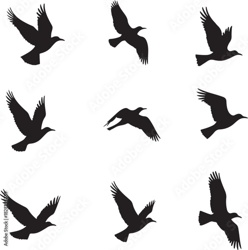 Naklejka premium Nine black bird silhouettes in flight on white background