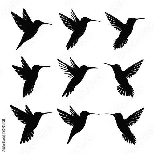 © Swapna graphics, Obraz premium Nine black hummingbird silhouettes in flight flying 4