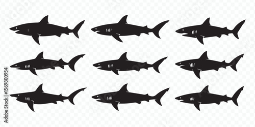 Fototapeta premium nine black shark silhouettes in various swimming poses for marine and ocean...