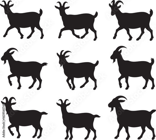 Fototapeta premium Nine Black Silhouette Goats in Various Poses on White Background animal farm