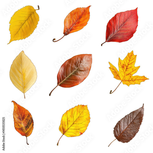 Obraz premium Nine Colorful Autumn Leaves with Detailed Veins Isolated on Transparent...