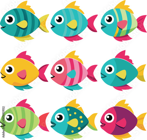 © Nikic, Fototapeta premium Nine colorful cartoon fish with stripes and dots illustration