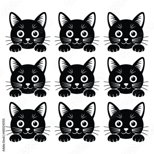 Fototapeta premium Nine cute black cat faces peeking out silhouette