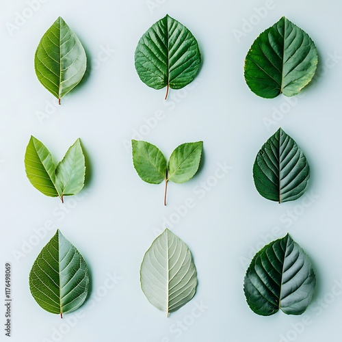 © Tcukimay, Fototapeta premium Nine green leaves arranged in a grid on a light blue background.