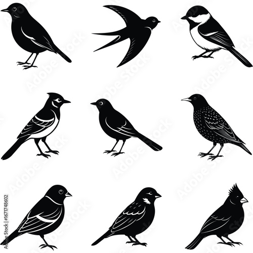 Fototapeta premium Nine Silhouette Bird Illustrations Songbird, Swallow, Chickadee, Magpie, Starling, Finch and Cardinal Graphics