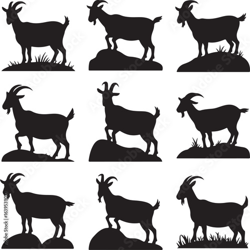 © vector , Fototapeta premium Nine Silhouette Goats Standing on Rocks and Grass on White Background animal farm