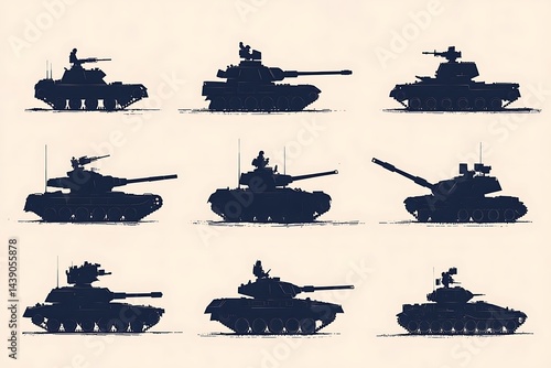 © Kapil, Fototapeta premium Nine tank silhouettes arrayed in grid formation on cream background illustration