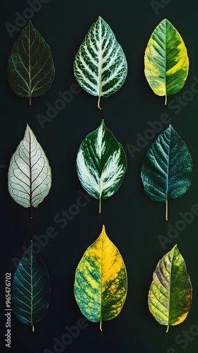 © rehan, Obraz premium Nine Varied Leaves Arranged in Three Rows on a Black Background