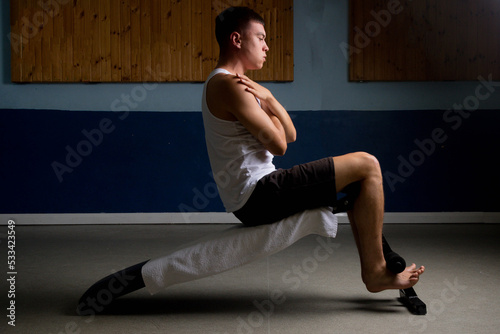 Fototapeta premium Nineteen year old teen boy doing situps in a tanktop
