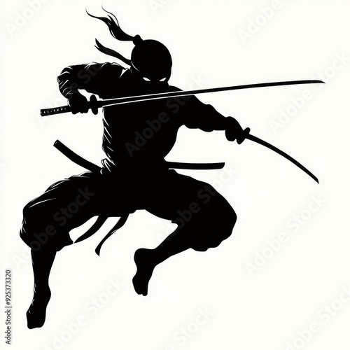 © Serhii, Obraz premium Ninja Jumping in Martial Arts Pose - Samurai Silhouette with Sword and Shuriken Weapons