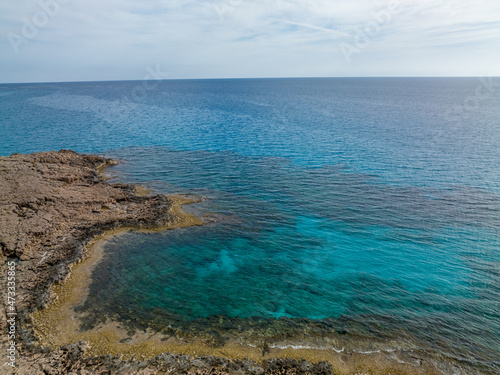 Obraz premium Nissi Beach in Ayia Napa, clean aerial photo of famous tourist beach in Cyprus, the place is a known destination on island and is formed from a smaller island just near the main shore