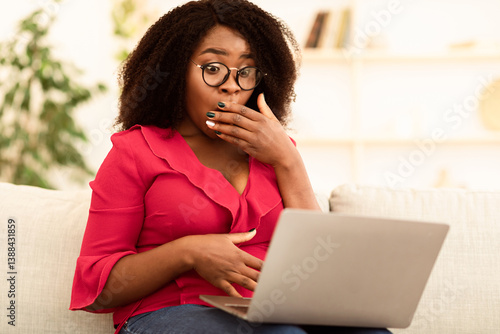 © Prostock-studio, Fototapeta premium No Way, I Can't Believe. Portrait ot surprised african american lady in glasses covering mouth in amazement, reading unexpected news on laptop computer, sitting on the couch at home, copy space