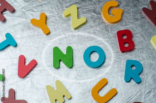 © HillLander, Naklejka premium NO word with colourful alphabet made of wooden. Business Idea co