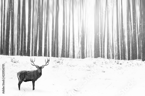 © delbars, Fototapeta premium Noble deer in the background of a winter fairy forest. Snowfall. Winter Christmas creative image. Minimalism concept. Black and white picture.