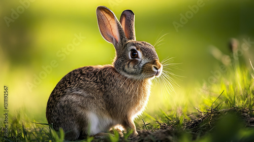 © Thanthara, Fototapeta premium noble rabbit sits gracefully on sunlit patch of grass