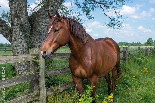 Fototapeta premium Noble steed beside an old wooden barrier in a tranquil meadow with a calm tree behind it