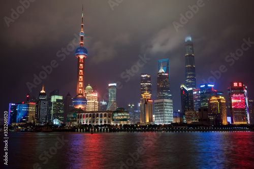 © othman, Obraz premium Nocna panorama kolorowo oświetlonej wieży telewizyjnej Oriental Pearl i innych drapaczy chmur po drugiej stronie rzeki Huangpu, widziana z Bundu.