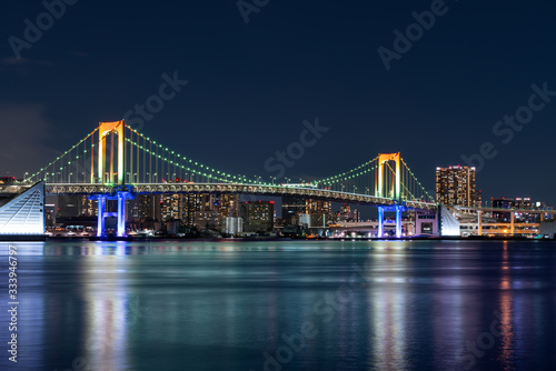 © Y.Mura, Fototapeta premium Nocny widok na oświetlony Tokyo Rainbow Bridge