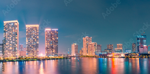 © camera papa, Obraz premium Nocny widok na wieżowce i wieżowce wokół Harumi