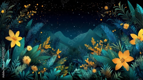© Artajar, Fototapeta premium Nocturnal Bloom Yellow Flowers and Teal Foliage Against a Dark Mountain Range