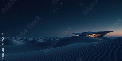 © Urenus Photos, Fototapeta premium Nocturnal Desert Haven A Futuristic Structure Illuminated Under a Starry Sky
