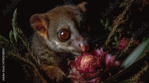 © Aiy JR Stock, Obraz premium Nocturnal lemur exploring flower in tropical forest