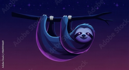Fototapeta premium Nocturnal mammal with glowing eyes hangs from a dark tree branch against a starry purple sky