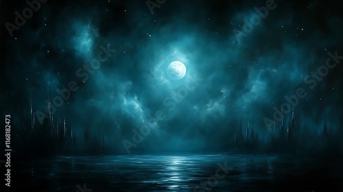 Fototapeta premium Nocturnal Seascape: Serene Moonlit Night with Silhouetted City