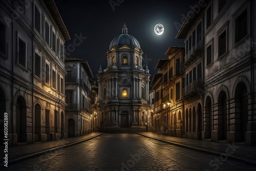 © Alesio, Fototapeta premium Nocturnal urban scenery with eliminated buildings. With the moon fully lit. Old buildings.