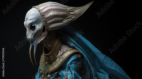 Naklejka premium Non-human biological alien creature in blue traditional suit, UFO concept....