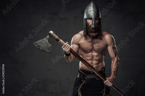 Naklejka premium Nord barbarian with naked torso and beard in helmet posing holding his two handed axe in dark studio background.