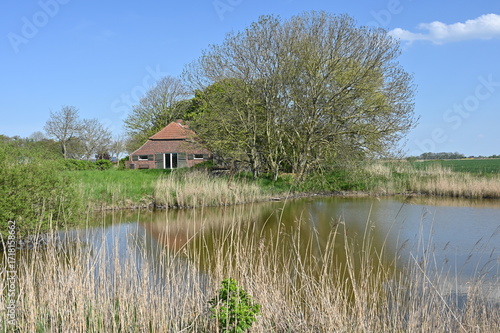 Obraz premium Norddeutsche Landschaft mit Tümpel, Baum und idyllischem Bauernhaus