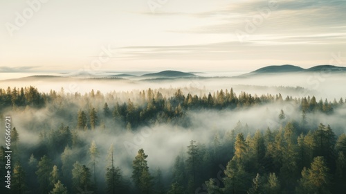 Fototapeta premium Nordic forest, forest landscape, foggy, evening time, foggy landscape in the jungle Fog and cloudy mountain tropic valley landscape aerial view, wide, misty panorama