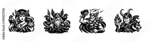 Obraz premium Nordic mythology characters vector illustration, black and white silhouette...