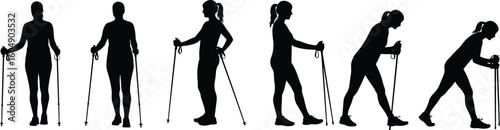 © MD. NUR ISLAM, Fototapeta premium Nordic walking silhouette, active woman with poles, fitness training, outdoor workout, healthy lifestyle, black vector illustration, exercise, wellness, motion