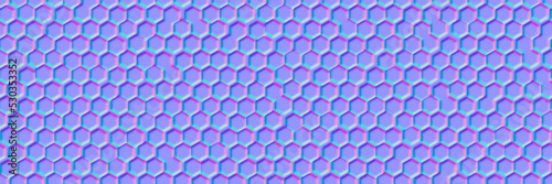 Fototapeta premium Normal map of uneven honeycomb or metal grid simple seamless pattern. Bump mapping of irregular hive cell texture. Hexagon geometry material 3d rendering shader illustration