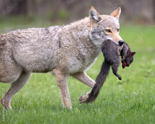 © Annette Buchkowski, Fototapeta premium North American coyote Canis latrans trotting through the grass of a suburban backyard carrying its prey a black squirrel in southern Ontario Canada