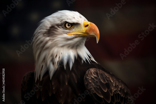 © Elena, Fototapeta premium North American Eagle on American flag. AI generated content