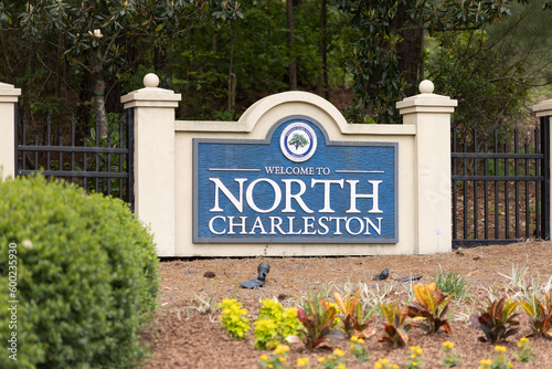 Obraz premium North Charleston, South Carolina city limits welcome sign with trees and...