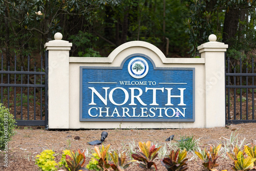 Obraz premium North Charleston, South Carolina city limits welcome sign with trees and...